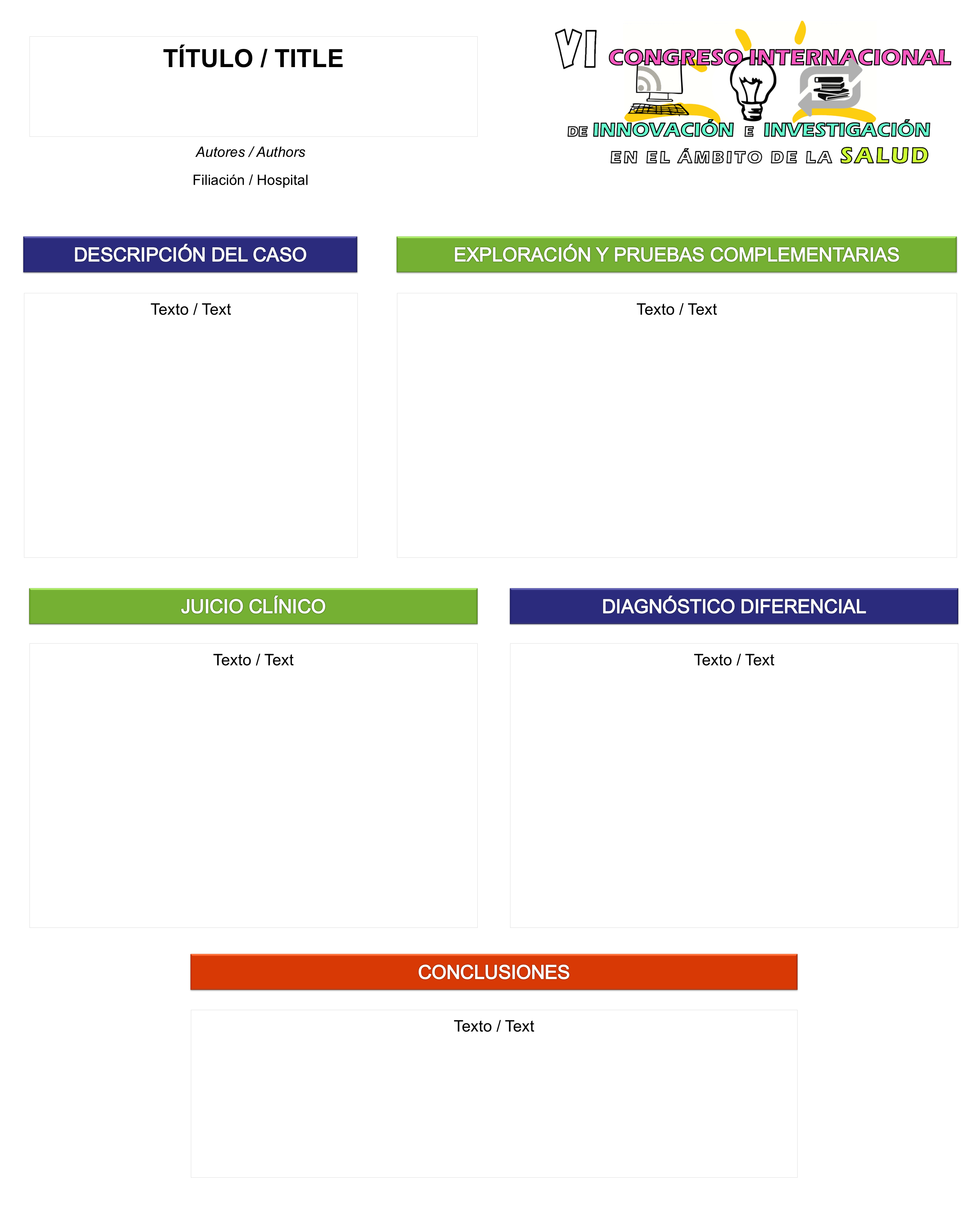 - Casos clínicos (opción disponible solo para contribuciones tipo póster/comunicación escrita). El contenido debe estar estructurado del siguiente modo: Breve descripción del caso, Exploración y pruebas complementarias, Juicio clínico, Diagnóstico diferencial, Plan de cuidados, Conclusiones.
